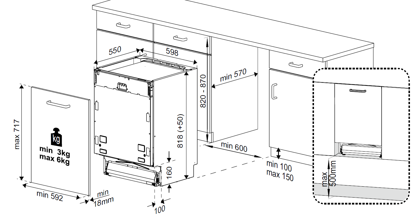 Размеры ниши для встраивания (Ш x В x Г): 600 x 820-870 x 590 мм