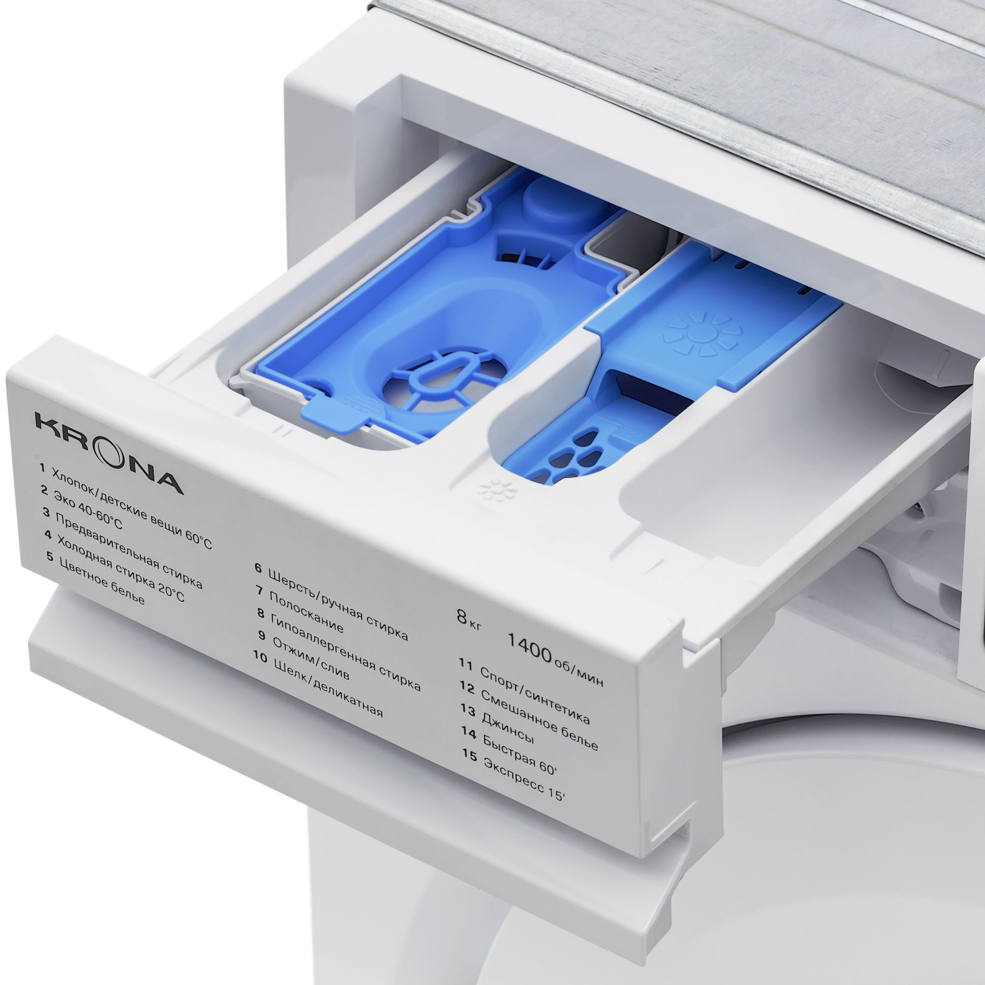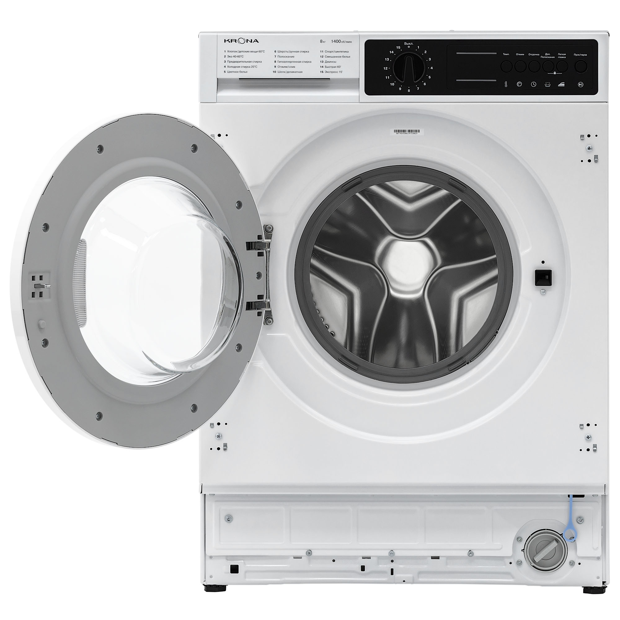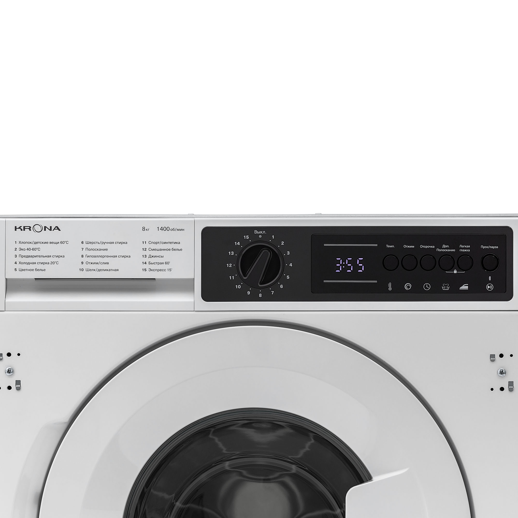 Встраиваемая стиральная машина KALISA объемом загрузки 8 кг оснащена 15 программами стирки для разных типов белья. Модель предусматривает настройку скорости отжима до 1400 об/мин, а также регулировку температур стирки в диапазоне 20-90 °С. Для вашего удобства в модели предусмотрена функция паузы, отложенный старт на 1-24 часа, дополнительное полоскание и режим легкой глажки. Безопасность пользователя обеспечивают такие функции как: блокировка управления от детей, электронная защита от перелива и протечек, контроль пенообразования. Стиральная машина KALISA отличается высоким классом энергоэффективности А+++, благодаря которому годовое потребление электроэнергии составляет всего 102 кВт.