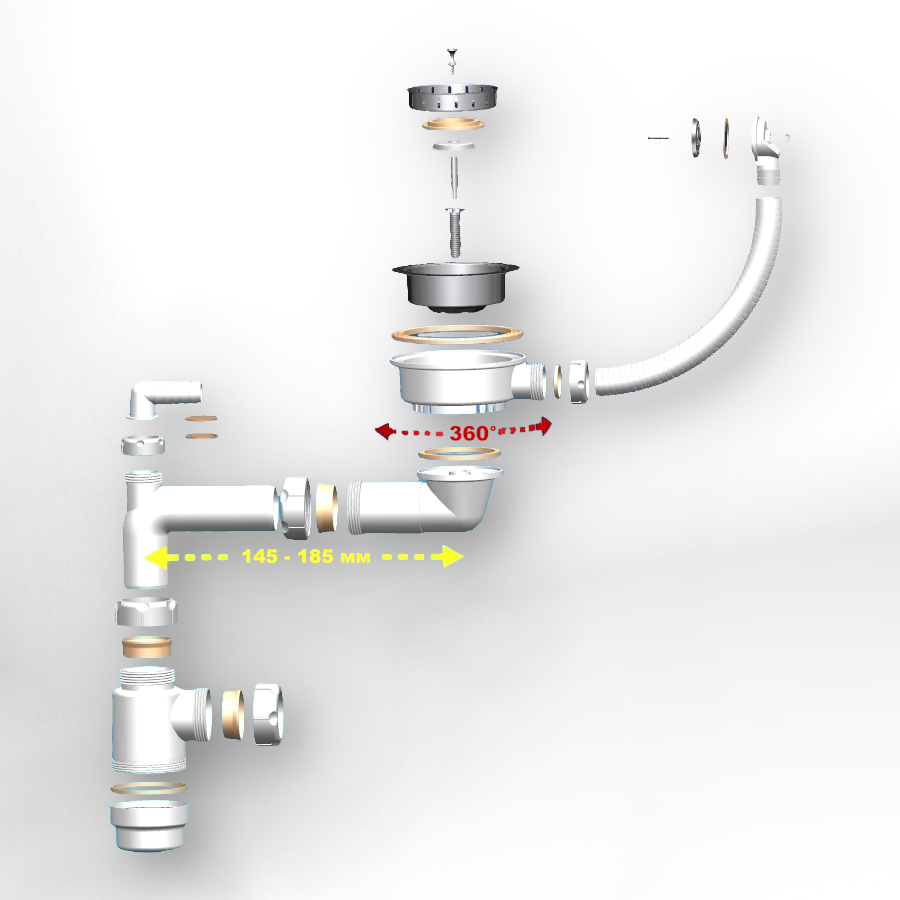 Сифон для кухонных моек с диаметром сливного отверстия 90мм, бутылочного типа. С разборным выпуском,нержавеющей решеткой, отводом для бытовой техники,с круглым переливом для композитных моек. Выход для подключения к канализации 40мм. Конструкция данного сифона имеет независимую поворотную систему, которая максимально увеличивает свободное пространство под мойкой и обеспечивает легкий процесс установки и подключения изделия. Поворотная пластиковая чаша создает быстрый слив воды из перелива независимо от его расположения в мойке. Корзинный нержавеющий клапан выпуска имеет дополнительные боковые отверстия, которые значительно увеличивают слив воды в канализацию. Данный сифон может дополнительно быть укомплектован декоративной накладкой