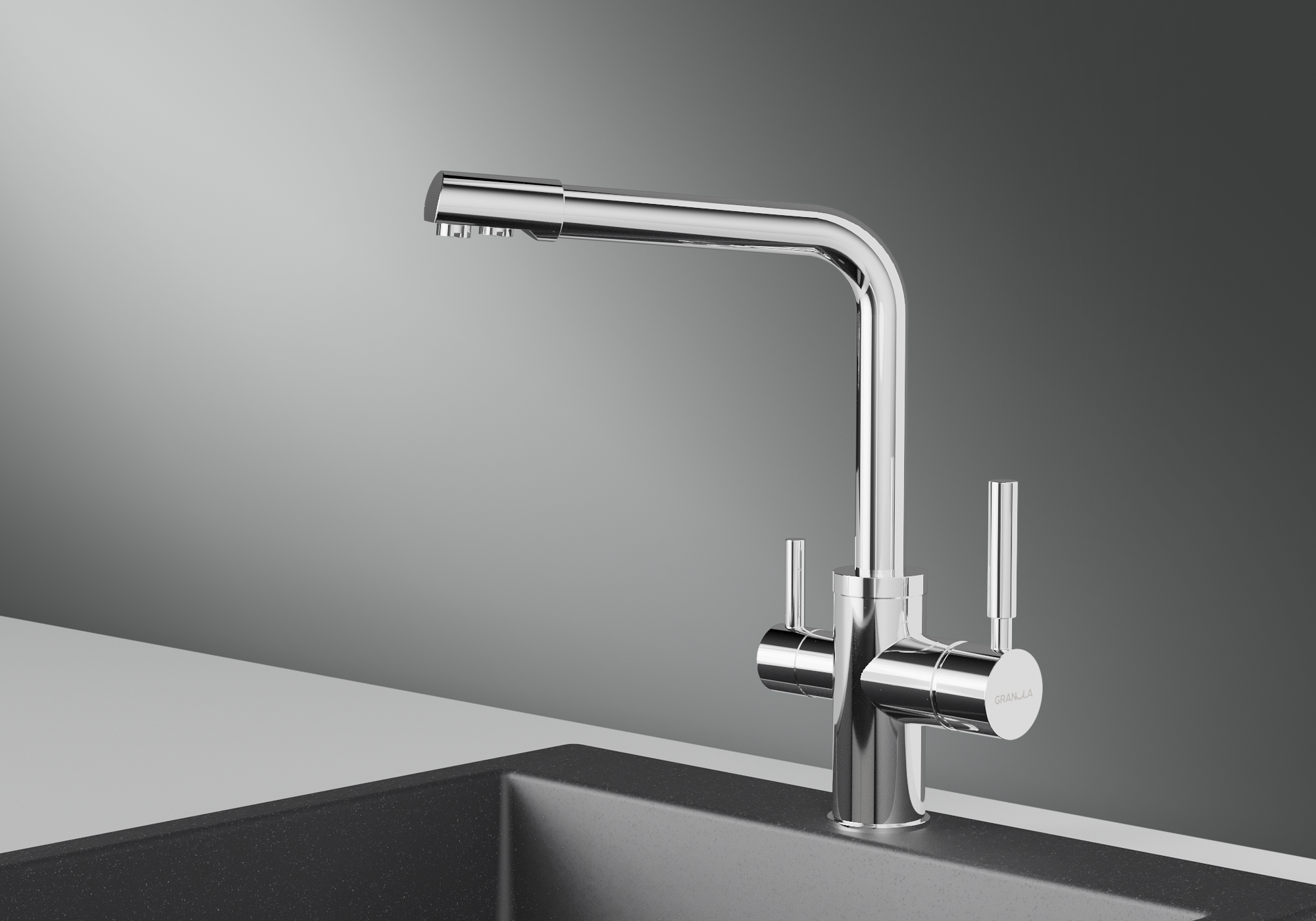 Смеситель для кухонной мойки Granula 2015 изготовлен из высококачественного материала. Латунный корпус обеспечивает длительный срок службы. При этом высокий излив позволяет мыть как мелкую, так и крупногабаритную посуду. Двухрычажная модель смесителя Granula 2015 выполнена с краном для питьевой воды. Фильтрованная вода подается по отдельной трубке и не смешивается с водопроводной водой.